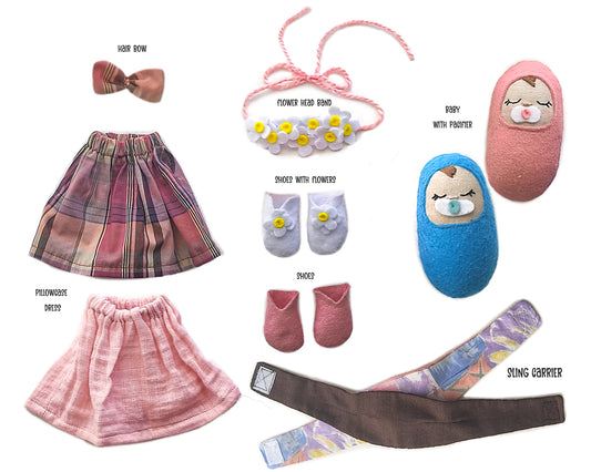 All clothes in the collection are removable, allowing for endless outfit options and creative play. The baby's face is beautifully embroidered and includes a non-removable pacifier, while the Mom's face combines craft plastic eyes and embroidery.