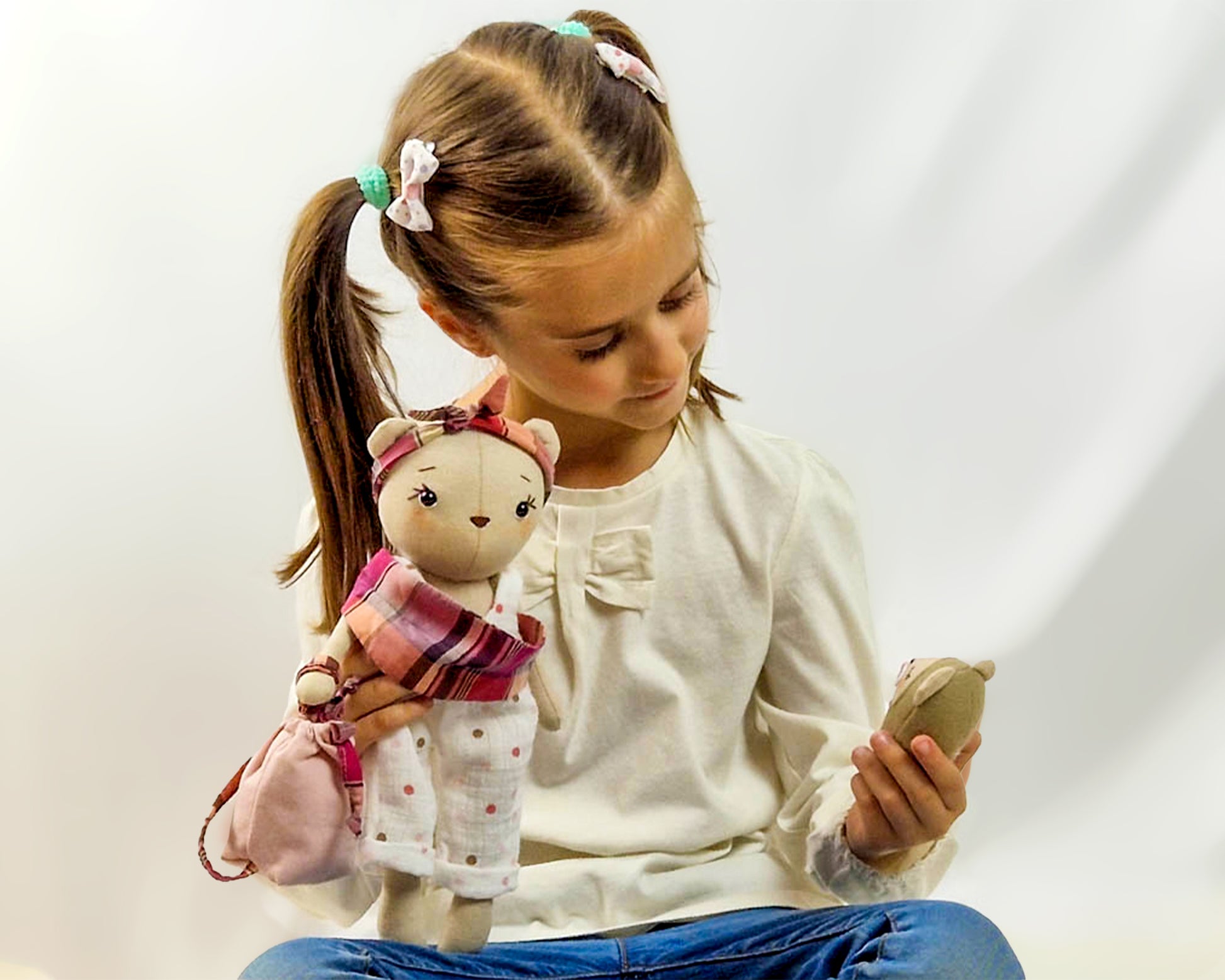 - Bear mom and baby rag doll set is machine sewn with seam allowance included;